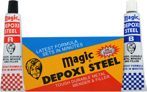Magic Depoxi Steel is the fastest curing, toughest mender. It has tremendous strength and durability. It can be applied as thick as needed in single application. No need to build up in thin layers since it dries by chemical reaction of the resin and hardener, rather than by air evaporation. Can be sanded, filled, drilled, tapped or threaded when dry and becomes extremely hard, solid metal within 4 to 20 minutes after application. No heat or pressure needed.