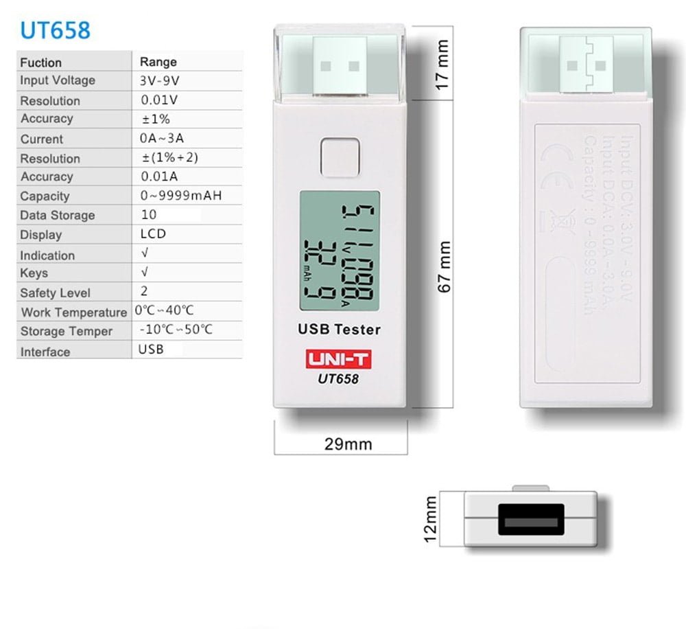 - Accurate Measurements: The UT658 USB tester provides accurate readings of voltage, current, capacity, and energy consumption. With its high-precision measurement capabilities, you can confidently evaluate the charging performance of your USB devices.